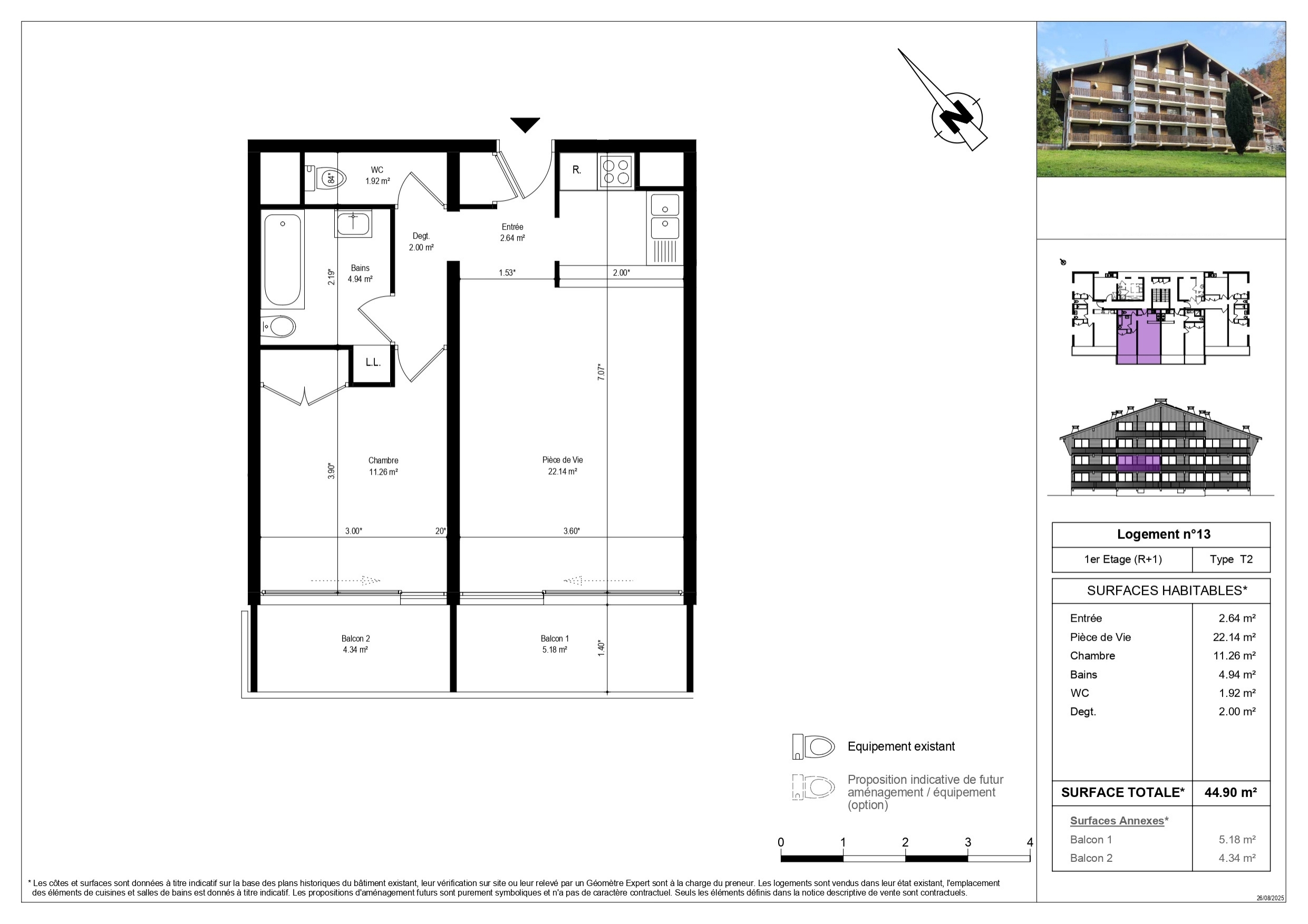 An entrance hall of 2.64 sqm, a corridor of 2.00 sqm, a living room of 22.14 sqm opening onto a 5.18 sqm balcony, a bedroom of 11.26 sqm with access to a 4.34 sqm balcony, a bathroom of 4.94 sqm, and a separate WC of 1.92 sqm.